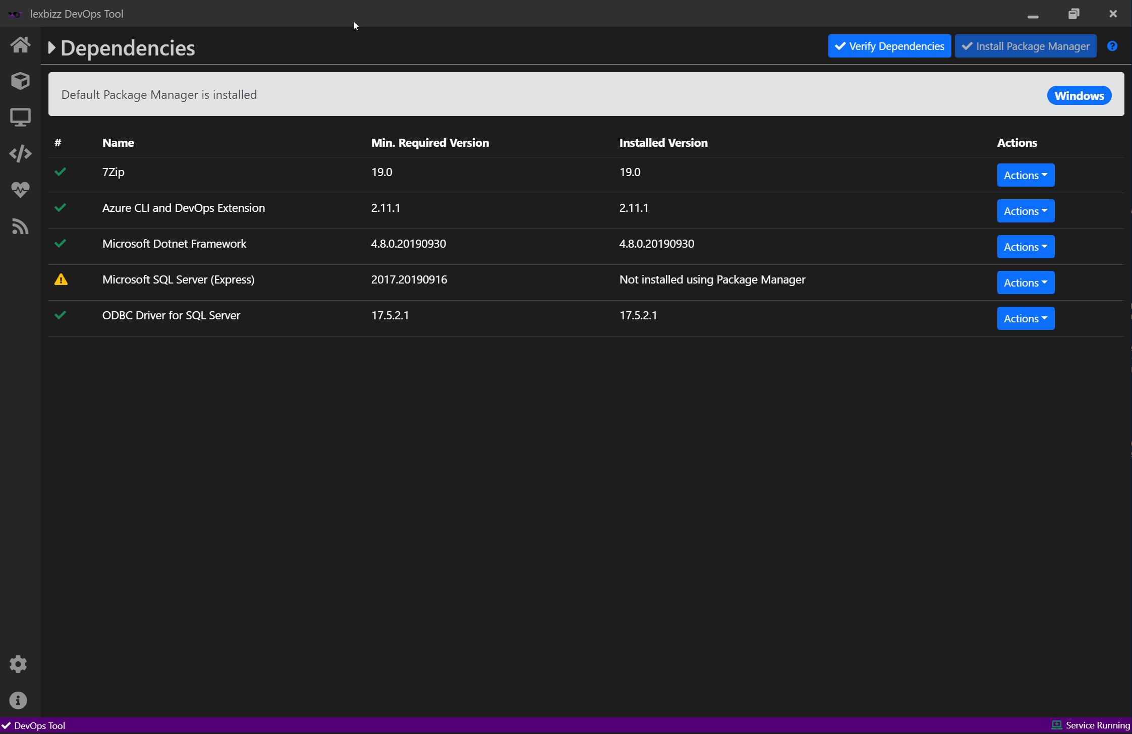 This operation allows you to verify the dependencies installed on your machine. Application will scan your system for all dependencies and at the end a summary report is presented. If the validation status is successful then you will be able to install lexbizz Application on your machine. In case the verification results in Failure then have a look at the summary and install missing packages.